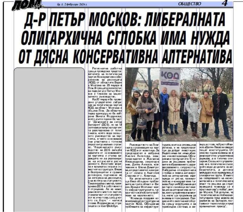 Регионална работна среща проведоха представителите на политическа партия Консервативно обединение на десницата (КОД) от областите Видин и Монтана на 29 януари в Лом. В срещата се включиха лидерът д-р Петър Москов и членове на националното ръководство.